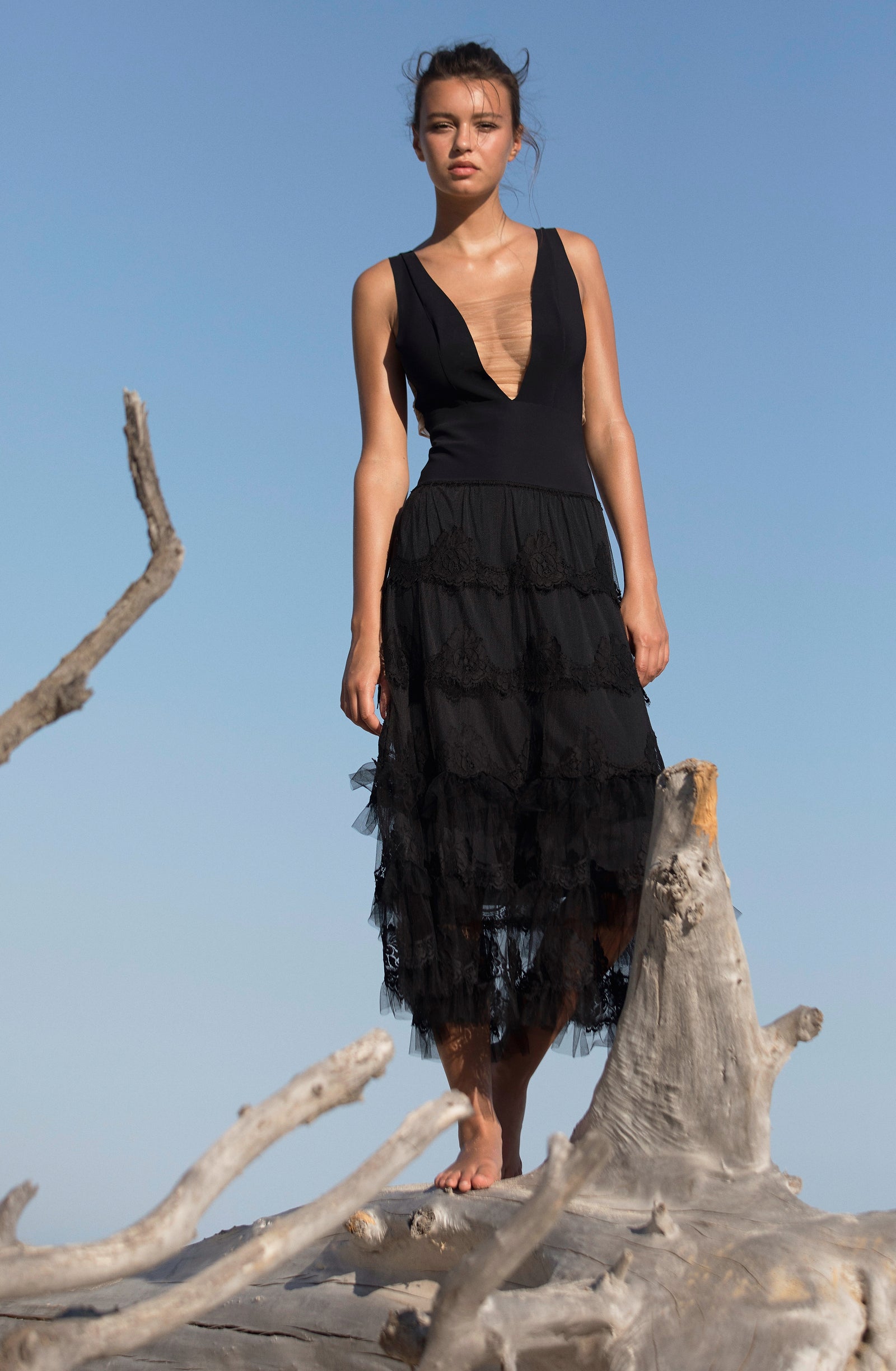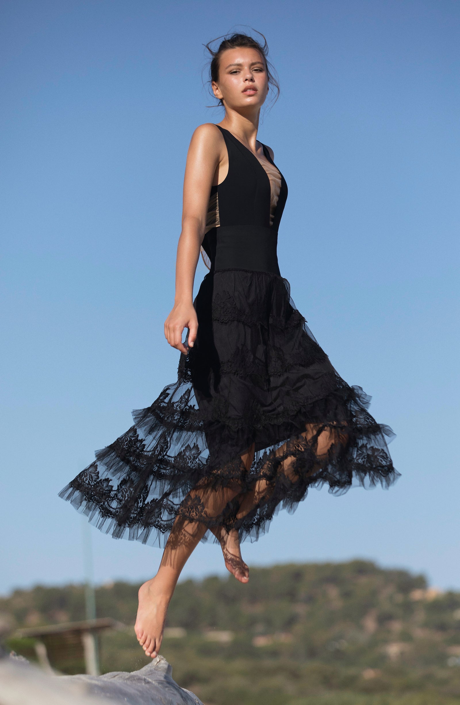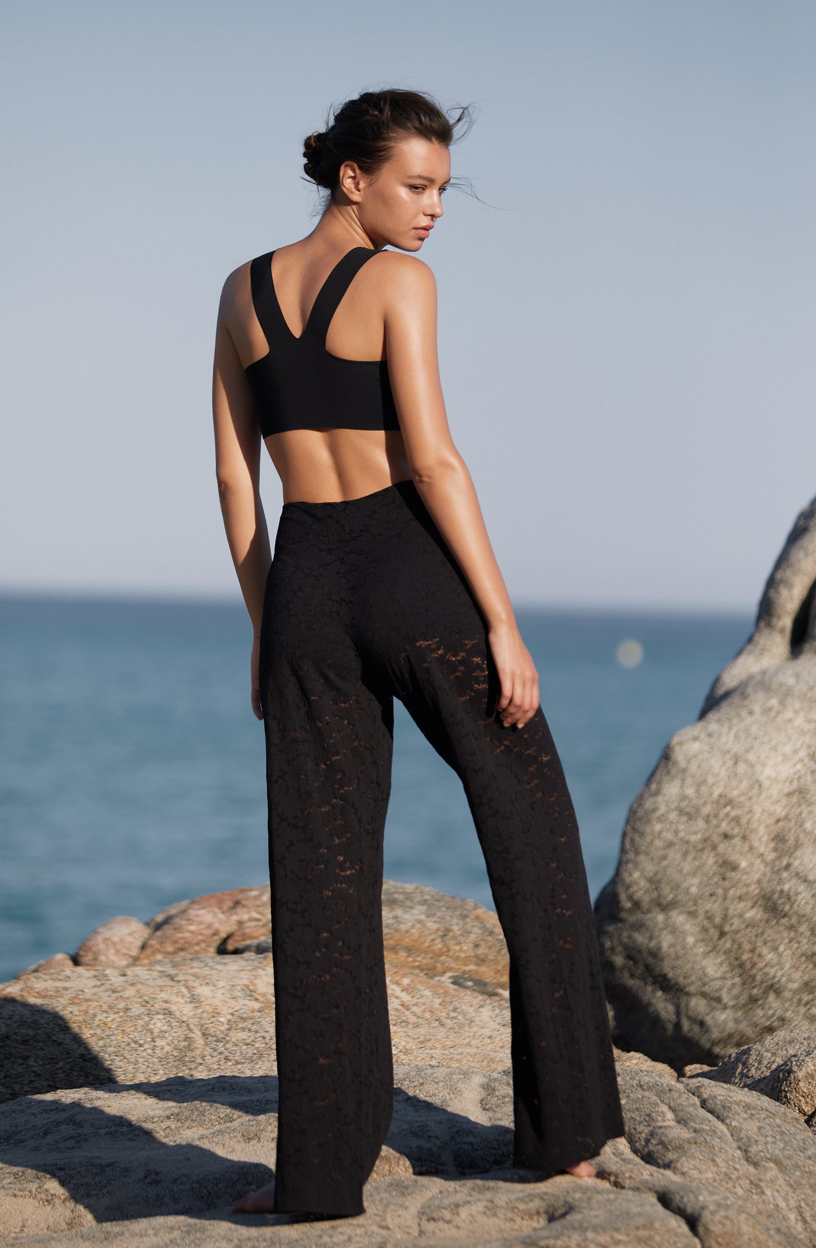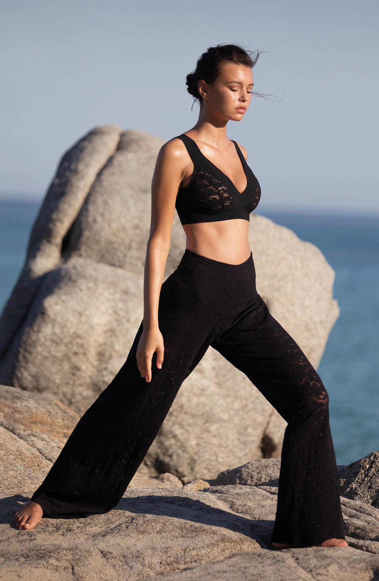 Relentless waves. Crashing waves. The sea, this eternal rebel, sets the pace of our summer days. Let’s go with the flow… Start the day with a sun salutation wearing a sports bra and lace trousers with tonic colours. The burning sand under our feet reminds us that summer is here. The suntanned and shimmering skin can be wrapped in a vintage floral print silky kimono, flowing second-skin opaque voile outfits: dresses and back crossed jumpsuits, deep V-necklines, short flimsy tops… Shoulders are bare under the blazing sun, in lace strapless tops and divine long skirts. Then as an awakening, with the sea echoing, time slows down. One more dance on the beach, when the night is falling, to make our lace petticoats swirl and remove the froth on the daydream.