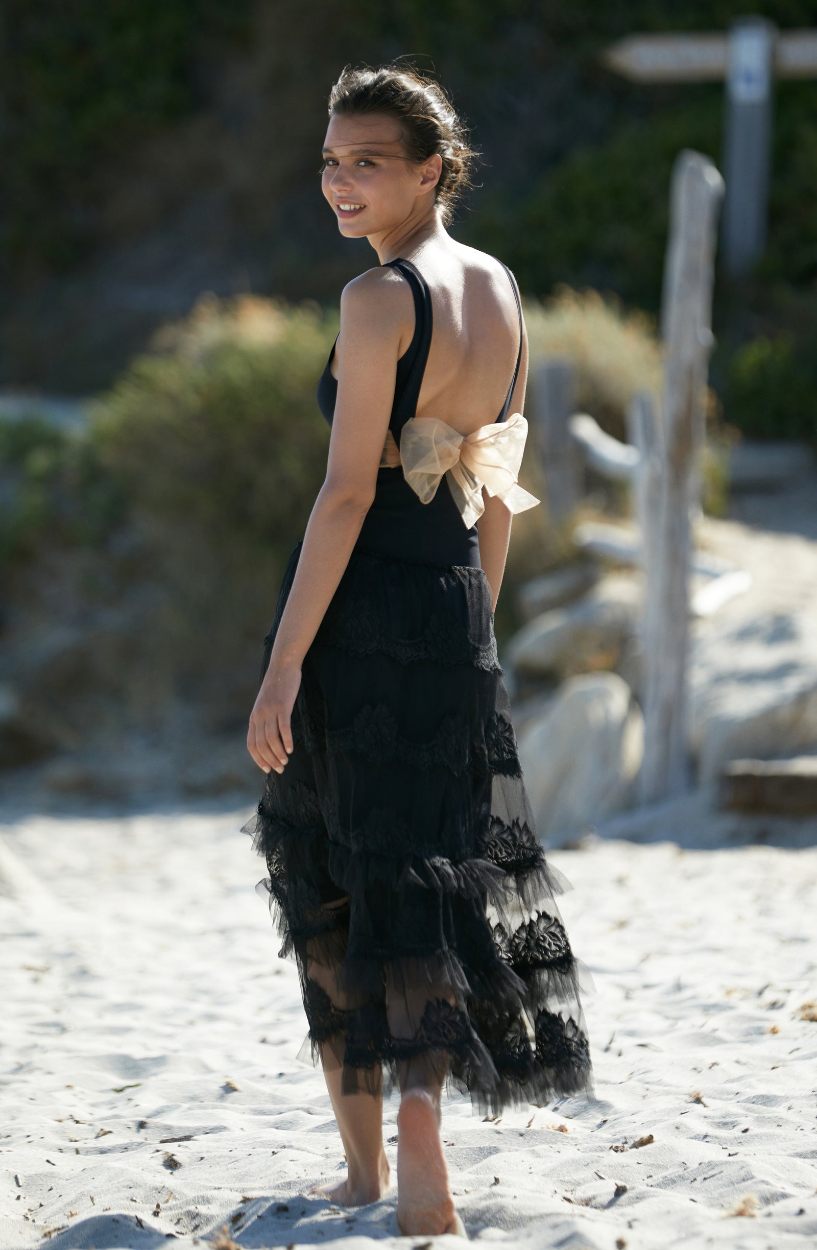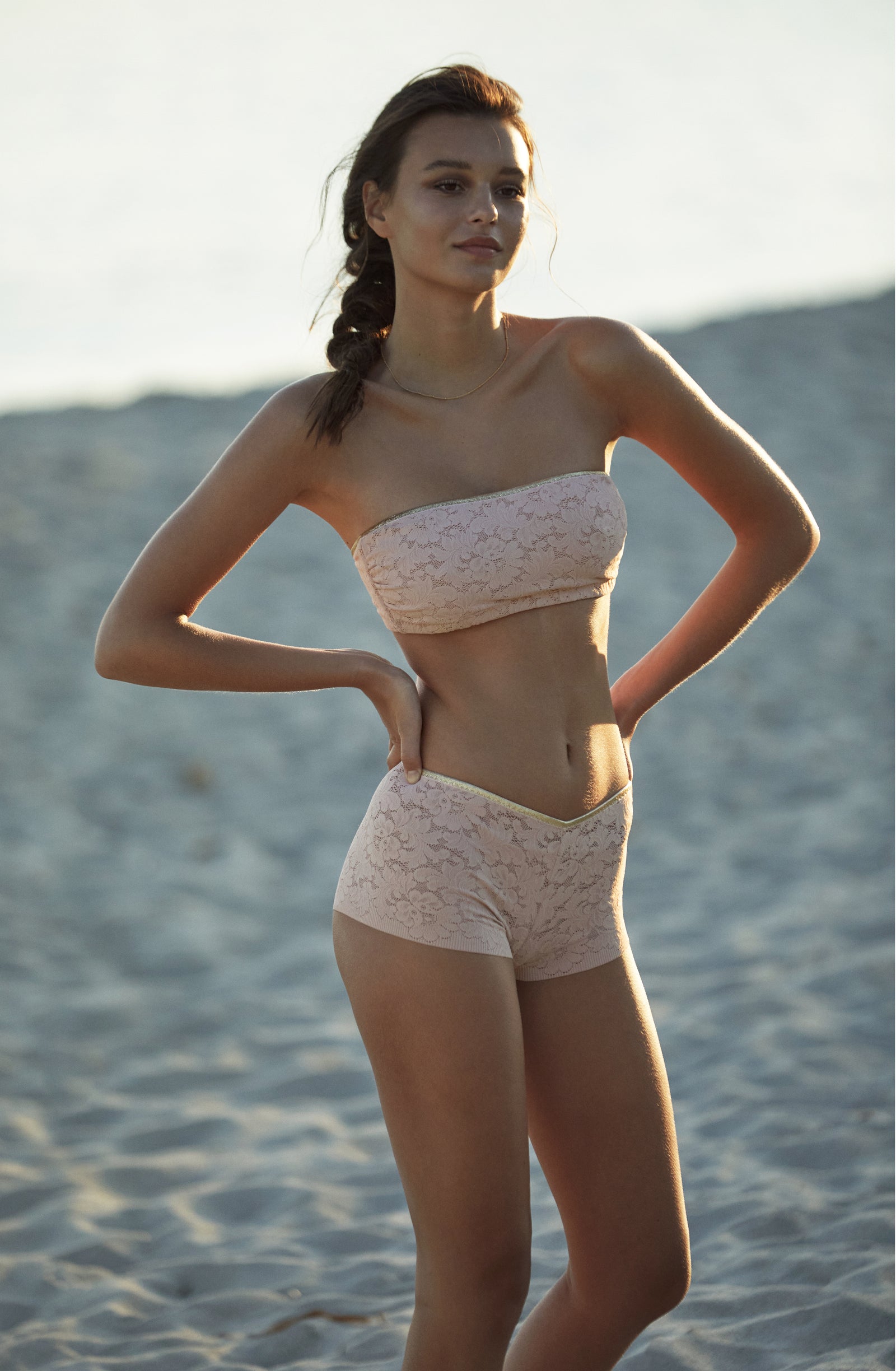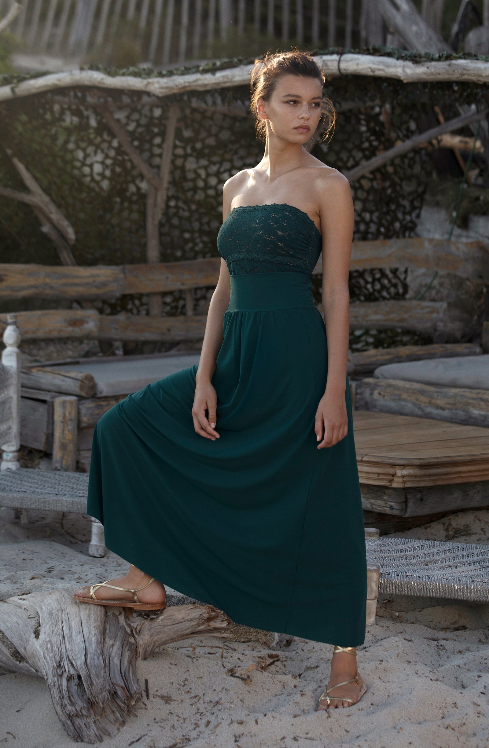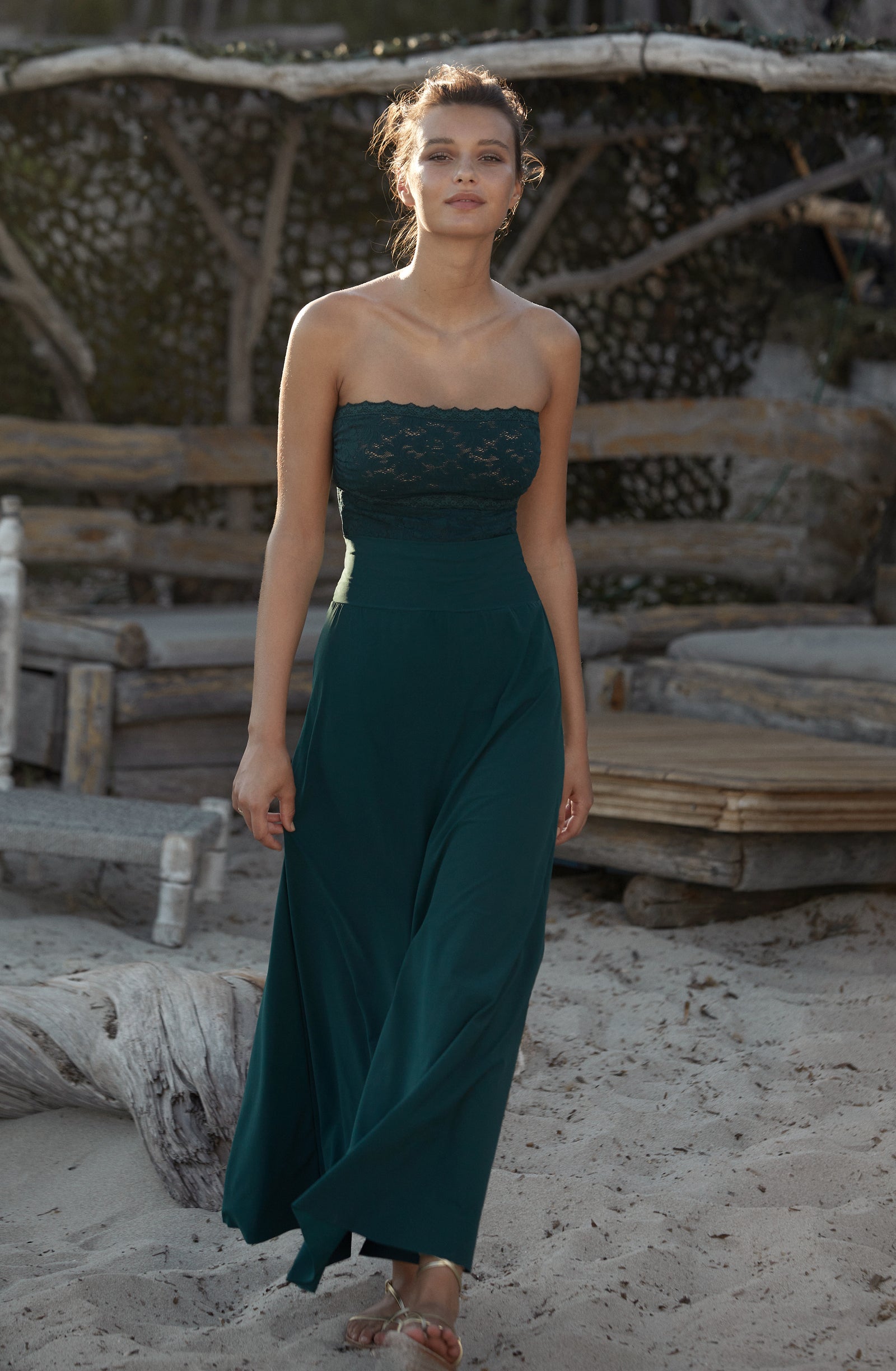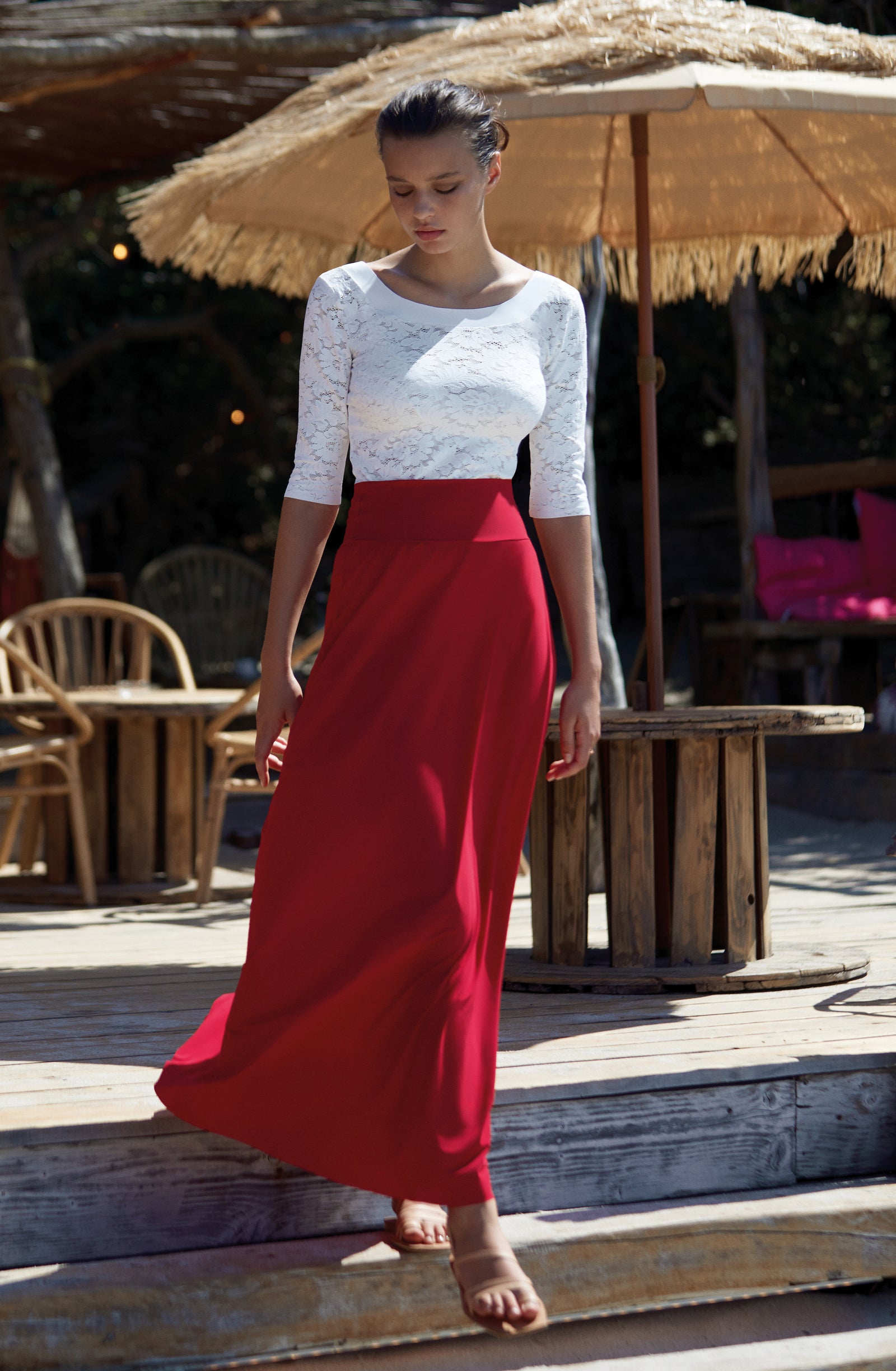 Relentless waves. Crashing waves. The sea, this eternal rebel, sets the pace of our summer days. Let’s go with the flow… Start the day with a sun salutation wearing a sports bra and lace trousers with tonic colours. The burning sand under our feet reminds us that summer is here. The suntanned and shimmering skin can be wrapped in a vintage floral print silky kimono, flowing second-skin opaque voile outfits: dresses and back crossed jumpsuits, deep V-necklines, short flimsy tops… Shoulders are bare under the blazing sun, in lace strapless tops and divine long skirts. Then as an awakening, with the sea echoing, time slows down. One more dance on the beach, when the night is falling, to make our lace petticoats swirl and remove the froth on the daydream.