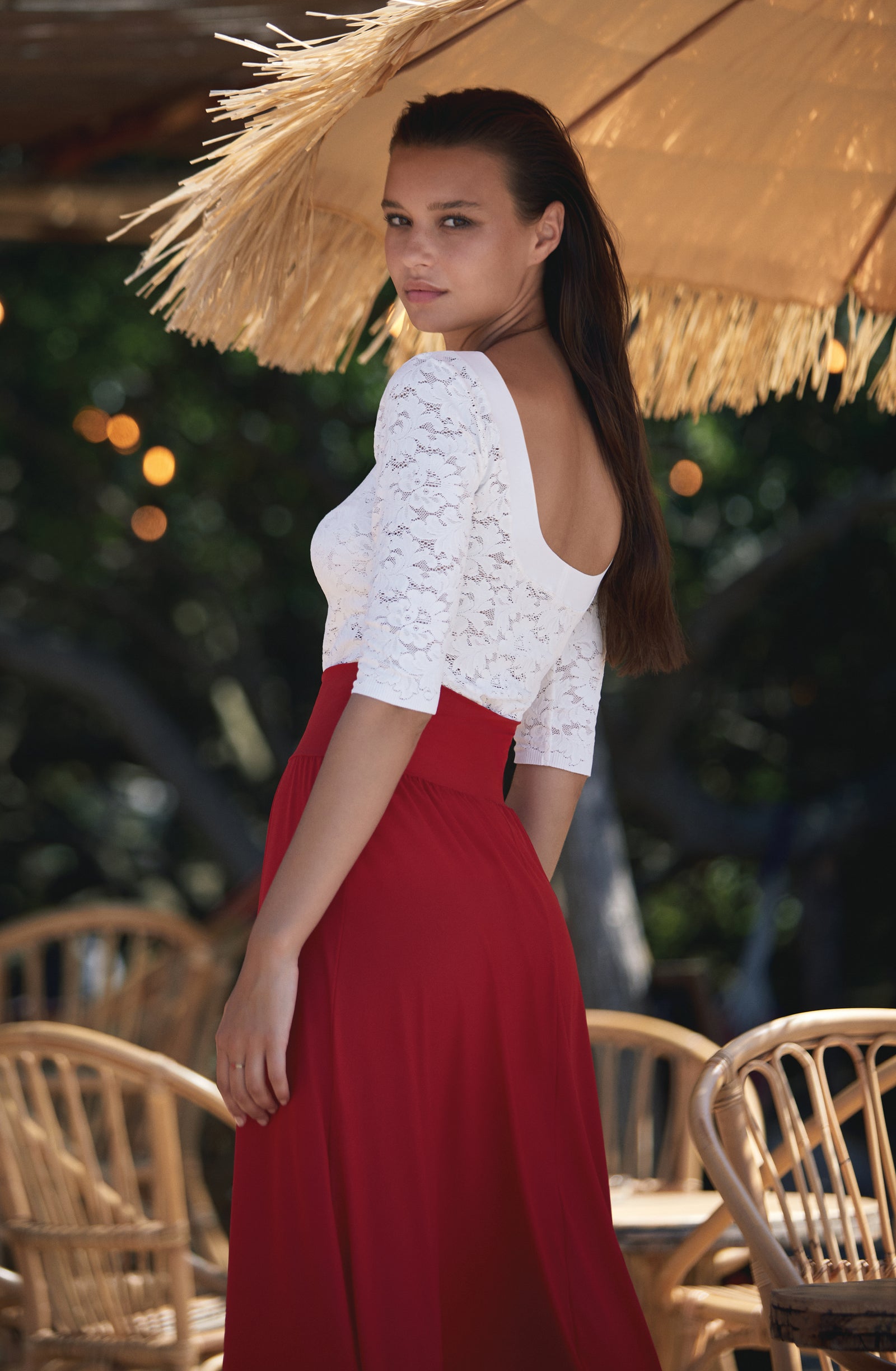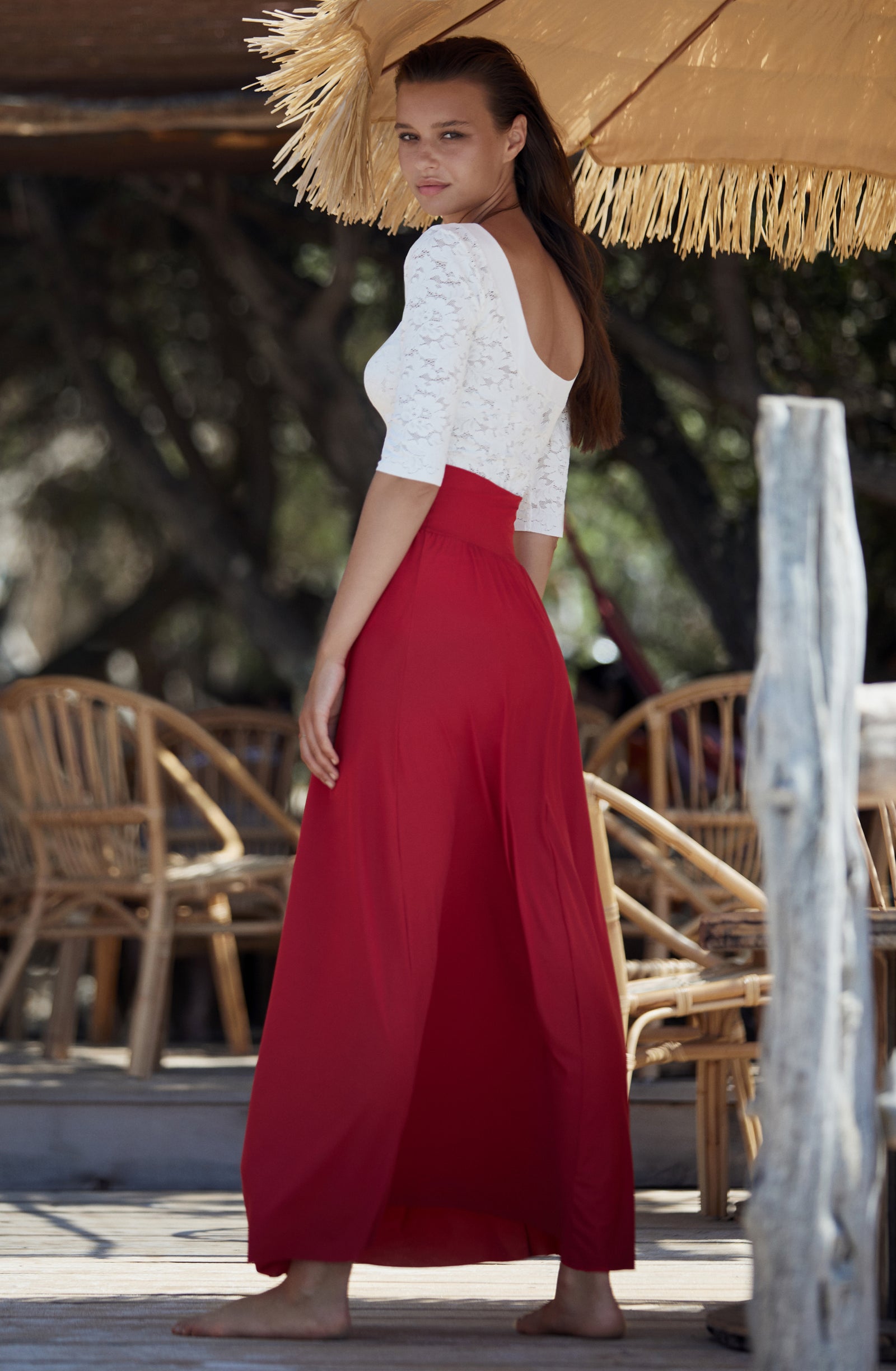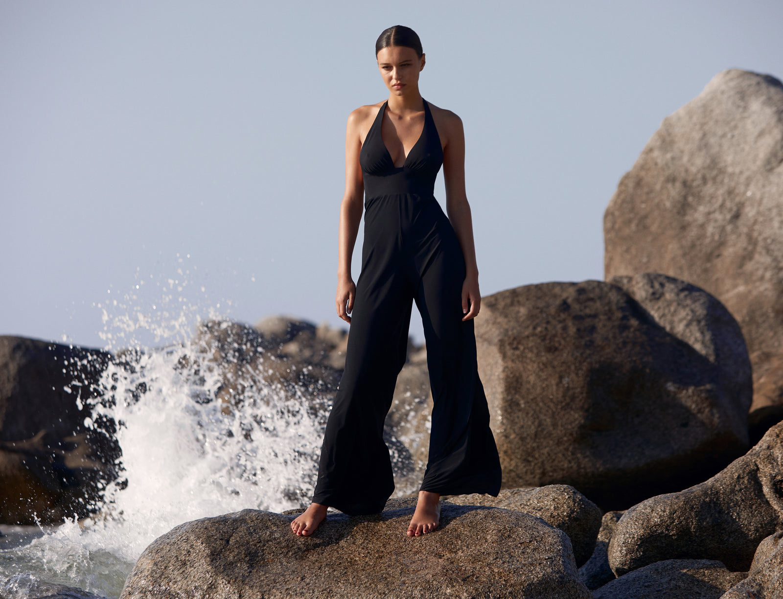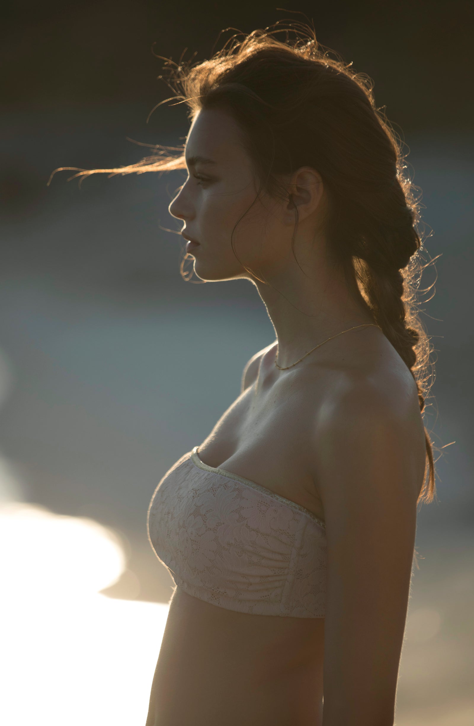 Relentless waves. Crashing waves. The sea, this eternal rebel, sets the pace of our summer days. Let’s go with the flow… Start the day with a sun salutation wearing a sports bra and lace trousers with tonic colours. The burning sand under our feet reminds us that summer is here. The suntanned and shimmering skin can be wrapped in a vintage floral print silky kimono, flowing second-skin opaque voile outfits: dresses and back crossed jumpsuits, deep V-necklines, short flimsy tops… Shoulders are bare under the blazing sun, in lace strapless tops and divine long skirts. Then as an awakening, with the sea echoing, time slows down. One more dance on the beach, when the night is falling, to make our lace petticoats swirl and remove the froth on the daydream.
