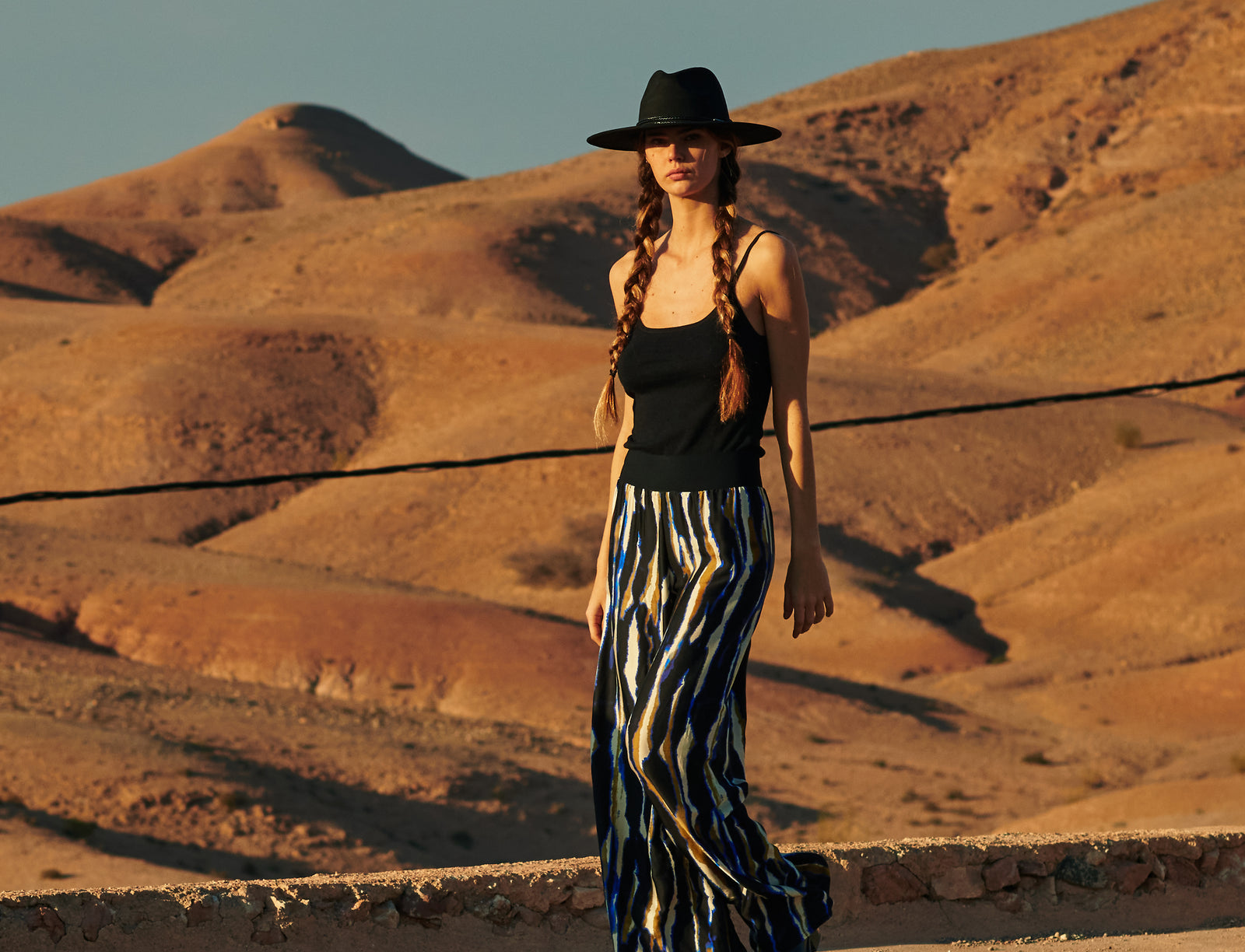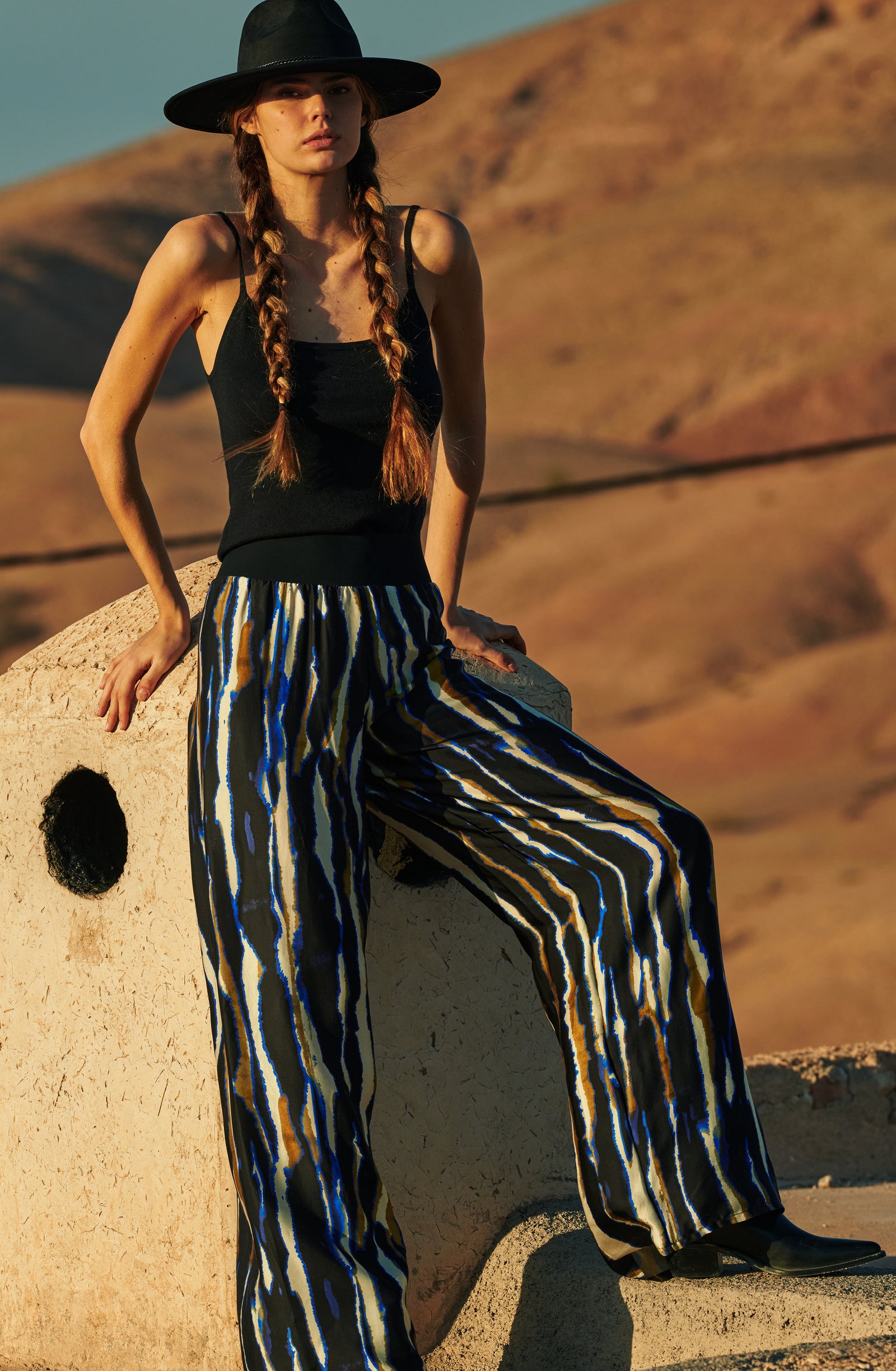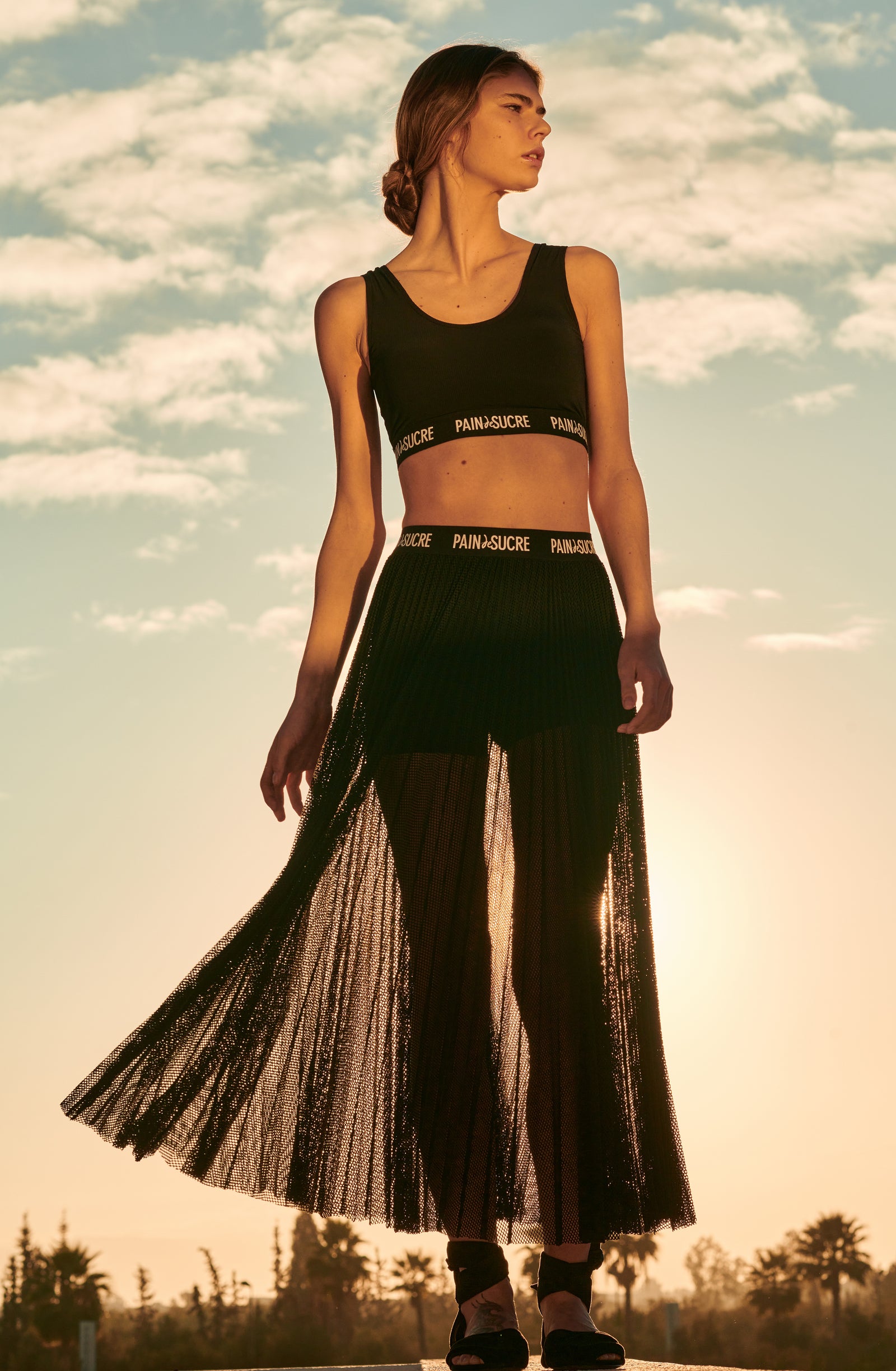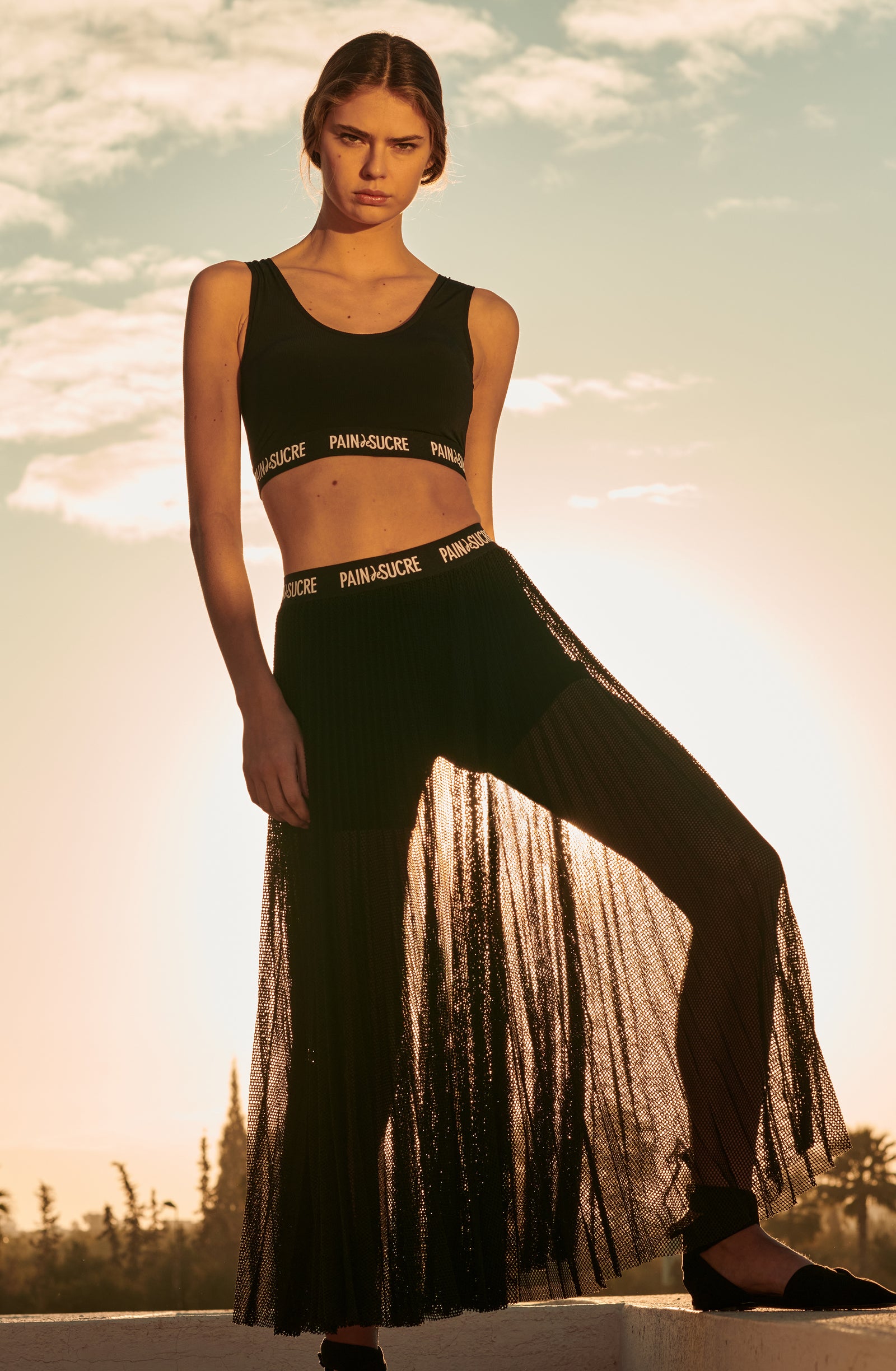 In the golden glow of the setting sun, PAIN DE SUCRE discloses its fall/winter 2025 collection, thus creating a magnetic atmosphere... A cinematic oasis unfolds at the gates of Marrakech, where the sand stretches as far as the eye can see, blurring the senses to wrap us into softness and serenity. The fabrics are noble and comfortable, the lines pure and the palette organic. Cashmere pieces, velvet flocked tulle lingerie line, revamped suits, chic dresses and sheer pleated petticoats, all illuminated by a bright tie and dye print blending ochre, ultramarine blue, snow-foam white from the Atlas Mountains… An enchanted interlude that establishes laziness as a caress, dreams into a truce and beauty glory.