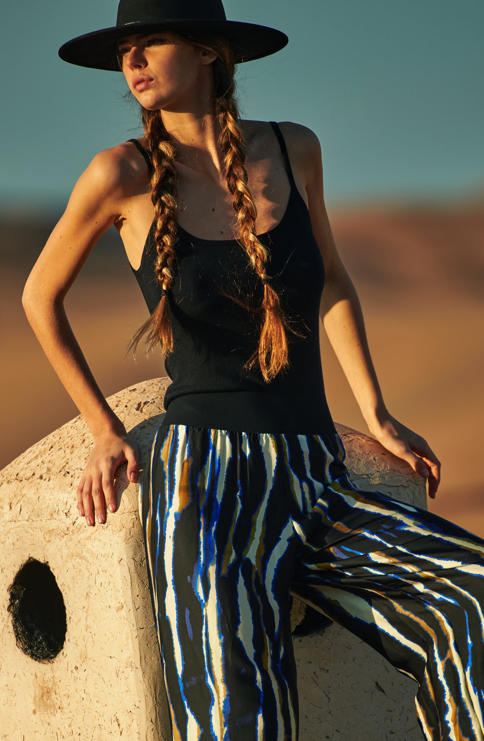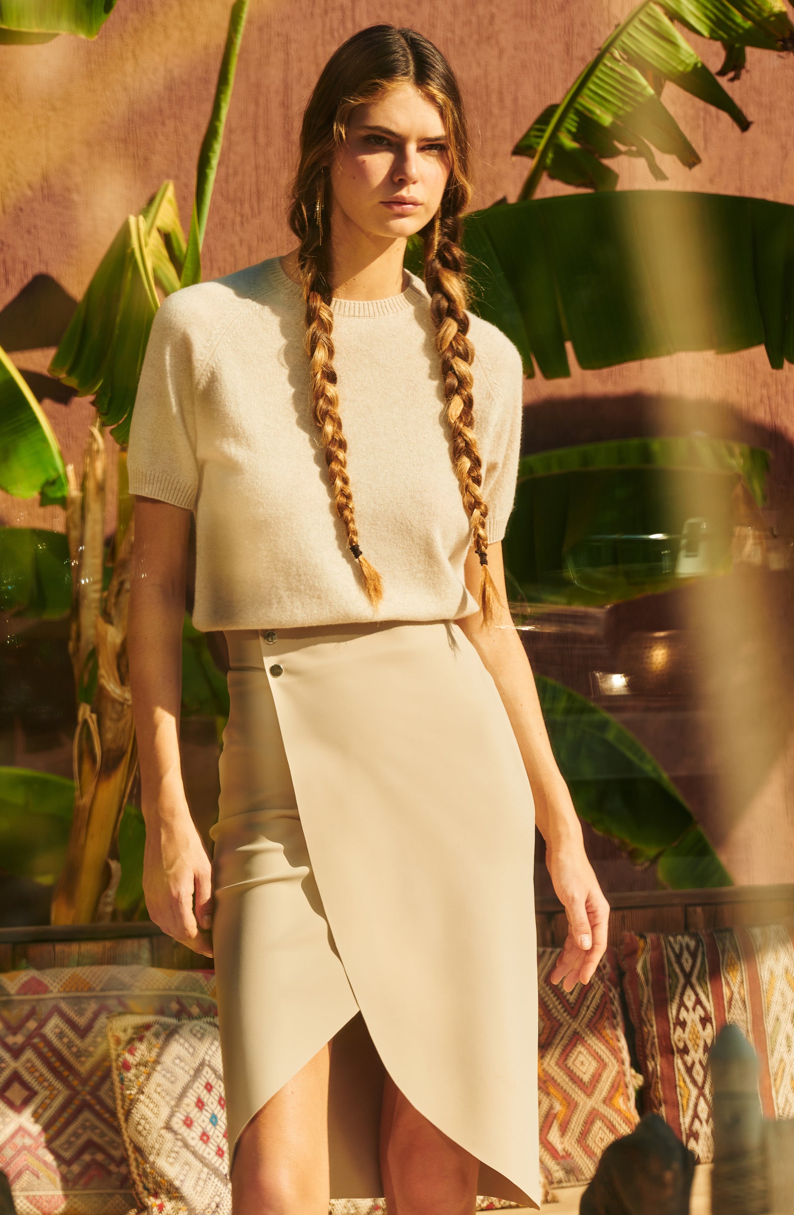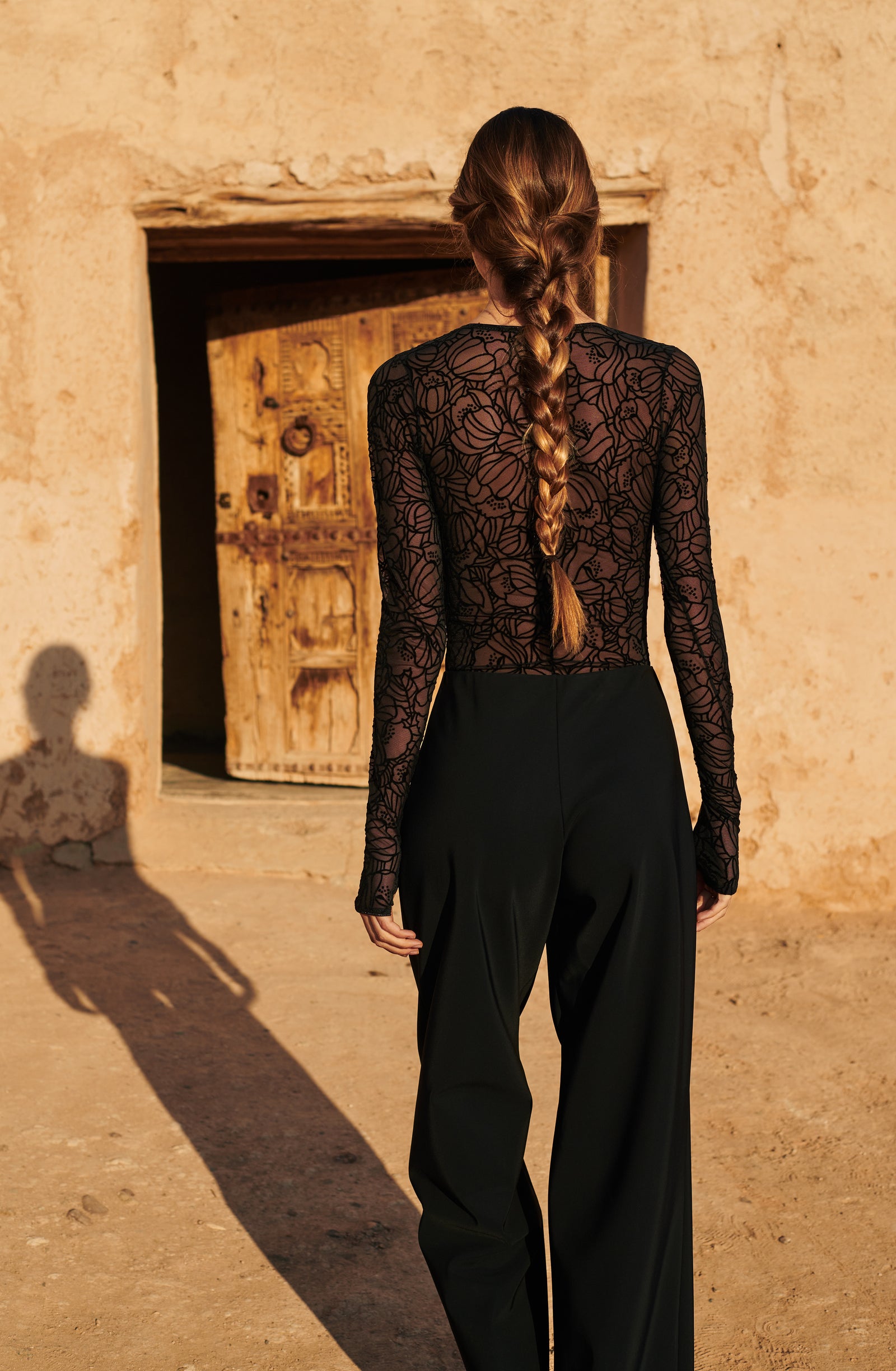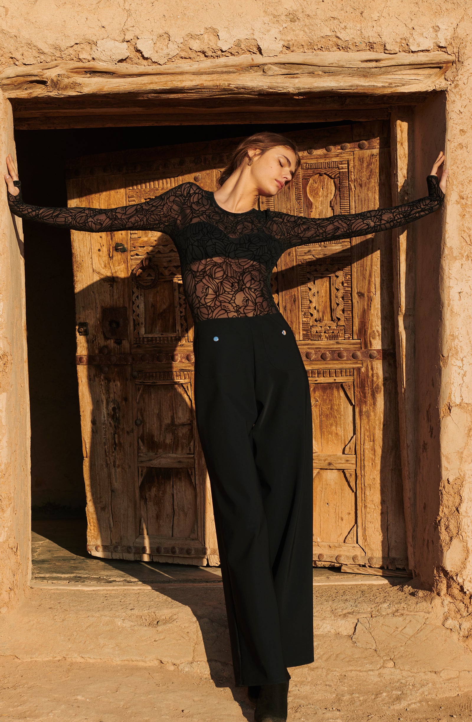 In the golden glow of the setting sun, PAIN DE SUCRE discloses its fall/winter 2025 collection, thus creating a magnetic atmosphere... A cinematic oasis unfolds at the gates of Marrakech, where the sand stretches as far as the eye can see, blurring the senses to wrap us into softness and serenity. The fabrics are noble and comfortable, the lines pure and the palette organic. Cashmere pieces, velvet flocked tulle lingerie line, revamped suits, chic dresses and sheer pleated petticoats, all illuminated by a bright tie and dye print blending ochre, ultramarine blue, snow-foam white from the Atlas Mountains… An enchanted interlude that establishes laziness as a caress, dreams into a truce and beauty glory.